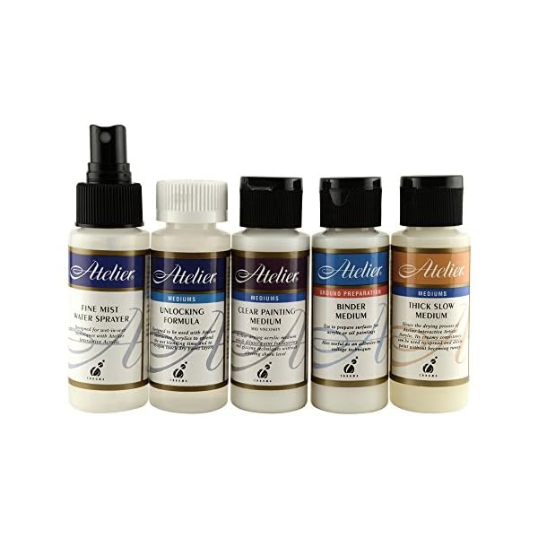 A 5-piece set of Atelier Interactive Paint Mediums for all kinds of unique painting applications. Included are: 2oz (60ml) bottles of Binder Medium, Clear Painting Medium, Thick Slow Medium, Unlocking Formula, and a Fine Mist Water Sprayer. Binder Medium can be utilized for sizing canvas to seal the outside, Clear Painting Medium can be utilized for glazing techniques, Thick Slow Medium slows drying time, and Unlocking Formula used within the Water Sprayer re-opens a paint layer even if it is dry so areas can also be re-worked and even got rid of.