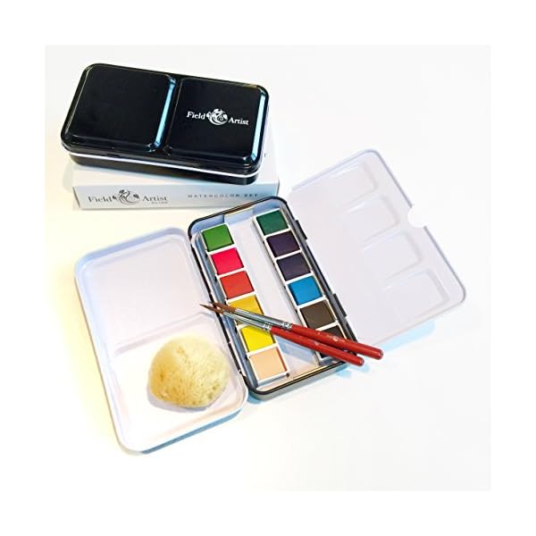The Field Artist Pro 12HP takes a classic metal watercolor box and turns it into a perfect “on-the-go” package for individuals who want a fully-equipped and lightweight rig for instant set-up and hand-held stability–all in a compact size! This set continues to gain popularity with die-hards and pros, even as it remains an outstanding all-around value for painters of any level. The Field Artist Pro 12HP or “Protege 12 Half Pan” at all times comes branded and packaged as a genuine Field Artist product, and is at all times shipped from UniverseArt/Amazon fulfillment with metal paint box, insert tray including 12 half pan colors, fold out mixing palette surface, two custom commute paint brushes, and a genuine Mediterranean silk sea sponge. This product conforms to ASTM-D4236 in accordance with US CPSC and LHAMA. Field Artist is a registered trademark of UniverseArt and is safe under federal laws as defined by the USPTO.