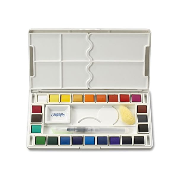 Contents: 24 Vibrant Colors in 24 mini watercolor cakes, FREE Water Brush To Transport and store water, A Porcelain Calligraphy Dish, Sea Sponge, All in a Plastic Case