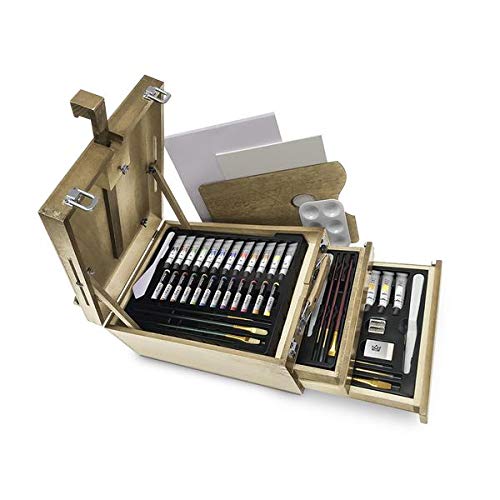 Wealthy hardwood box that comes with a built in easel and draws that latch closed full of quality artist materials