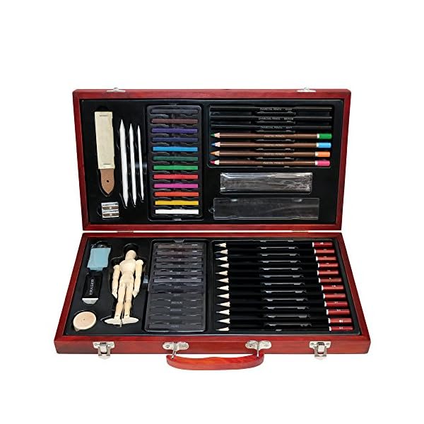 Sketch set 58 PCS: Include 12Compressed Color Lead Sticks,6 Compressed Charcoal Sticks,6 Compressed Lead Sticks,1 Wooded Care for Case, 12 Graphite Pencils, 1 A5 Sketching Pad, 3 Blending Stumps, 1 Sandpaper Block, 3 Charcoal Pencils, 1 Kneaded Eraser, 4 Vine Charcoals, 4 Pastel Pencils, 1 Mannequin,1 Sharpener, 1 Eraser, 1 Ruler. It is a diverse, multi-faceted art kit designed by the pros at Castle Arts to meet the needs of artists at all levels. Warning! Not suitable for children under 3 years.