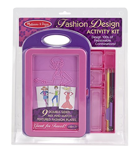 16 pieces come with 9 double-sided, textured fashion plates, 4 pencils, 1 crayon, crayon holder, and storage case
