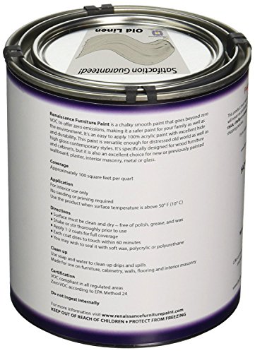 Renaissance Furniture Paint was once designed with you, your family and the environment’s safety in mind. Zero VOC’s (Volatile Organic Compounds) and zero emissions. There is not any CA Prop 65 warning on this can. This paint does not have the dangerous chemicals that require this sort of warning! All this with the fantastic coverage that Frequently only takes one to two coats! It’s an easy to apply 100% acrylic coating in a chalky smooth finish with excellent hide and durability. This fantastic paint is versatile enough for distressed old world in addition to high gloss contemporary styles. It’s specifically designed for wood furniture and cabinets and a great choice for most other surfaces. – Tips, Techniques and Instructions included- Non Toxic- – Thick, even self-leveling coverage- Dries in 20 minutes- Durable finish that passes the fingernail scratch test- Silky chalky finish that is smooth to the touch- No surface prep required on a clean surface- Virtually no odor- Hypoallergenic- Manufactured in the united states- No sanding or priming required HOW-TO VIDEOS, LIVE SUPPORT AND INSTRUCTIONSYou do not have to tackle that project alone.- How-to videos for every type of project will also be found on the manufacturer’s website.- Live online help offered through the manufacturer’s fb page- Instructions included with every quart or kit purchased