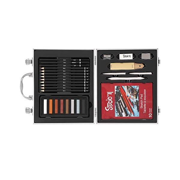 This art set from Studio 71 includes 28 pieces of more than a few sketching Provides and tools, all neatly organized in a transportable sporting case. Portable case has convenient sporting take care of, two closure snaps to keep art Provides protected and protected, and designated product slots within to keep Provides organized.