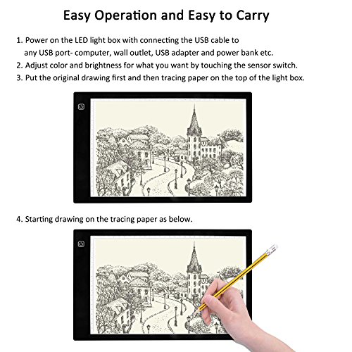 ✔ ADJUSTABLE BRIGHTNESS W/ EASY 3 LIGHT SETTINGS- This A4 drawing pad is with touch sensor switch and dimmer regulate of 3 brightness levels’, You’ll get your ideal brightness with ease.