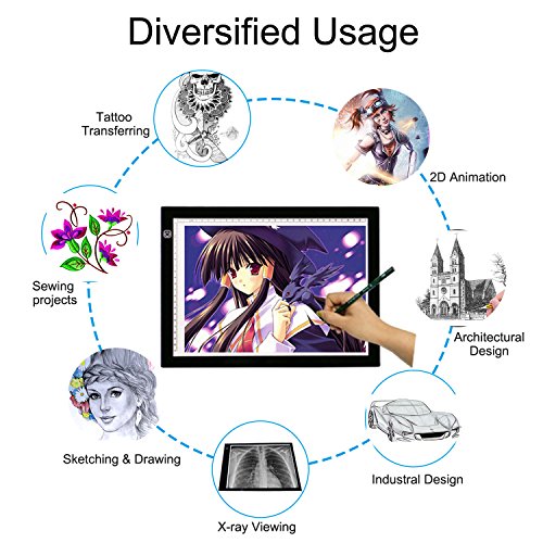 ✔ MULTIPLE USE- The tracing light box can also be widely used in Sketching & Drawing, 2D Animation, Architectural Design, Industrial Design, Sewing projects, Tattoo Transferring, X-ray Viewing, and so on. Everybody can use thanks to its simplicity, everybody can also be an artist!