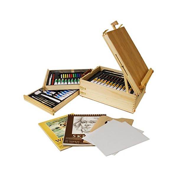 US Art Provide® ninety five-Piece Picket Box Easel Painting Set – 12-tubes of Oil Colours, 12 Oil Pastels, Plastic Palette Knife, 3 Assorted Oil Painting Brushes, 2-ea 8″x10″ Canvas Panels