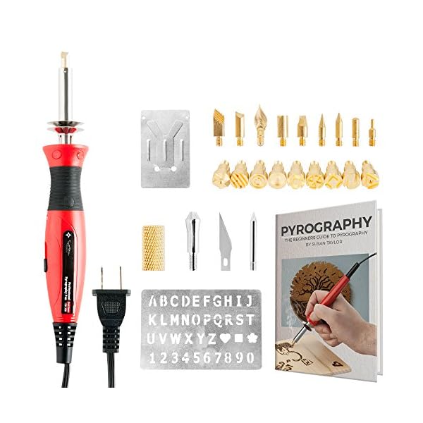 WHAT IS INCLUDED: 1 x Pyrography Woodburning Pen, 10 x Assorted Wood Burning and Soldering Tips, 9 x Assorted Wood Embossing Tips, 1 x Hot Knife Chuck with 1 x Blade, 1 x Stencil, 1 x Wood Burning Pen Holder, 1 x Carrying Case, 1 x Quick Start Instruction, 1 x Beginners guide to pyrography e-book with 10 DIY projects.