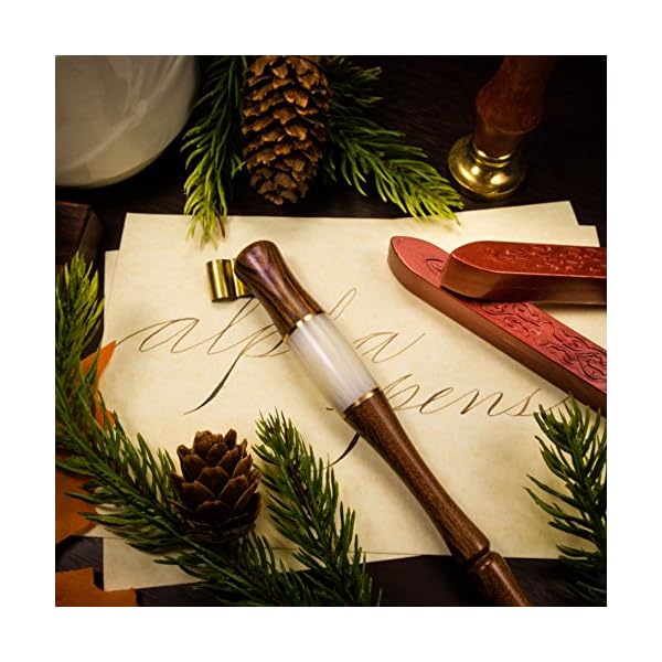 This elegant calligraphy oblique nib holder is for many who are intermediate or advanced in calligraphy. This wooden oblique nib calligraphy holder can hold and fit most nibs out there. The nibs it likely fits are: Brause Steno, Brause Rose, Brause 513 [Remove flange and place nib], and Brause 66 EF [Remove flange and place nib], Gillot 170, Gillot 303, Gillot Rigid, Gillot 404 [Remove flange and place nib],Hunt 22, Hunt 99 [Remove flange and place nib], Hunt 100, Hunt 101, Hunt 103, Nikko G, Zebra G, Leonardt G [Remove flange and place nib], and the Leonardt Principal EF [Remove flange and place nib]. If the nib cannot fit, you’ll be able to carefully adjust the brass flange with pliers. The brass flange isn’t removable. This holder is light weight, has medium thickness, and features a gorgeous ornamental design and a beautiful box with a lovely Alpha Pens wax seal.