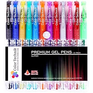 Glitter Gel Pens by Color Technik, Set of 12 Professional Artist Quality Pens, Best Gel Pen Colors with Comfort Grip…